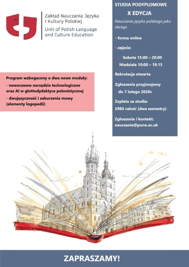 Zainteresowanych prosimy o kontakt mailowy: polishlanguage@puno.ac.uk